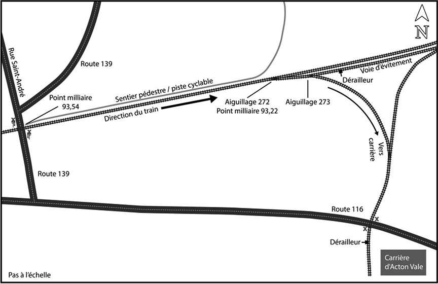 Le 11 août 2016, le train de marchandises M39421-11 de la Compagnie des chemins de fer nationaux du Canada (CN) a quitté Montréal (Québec) et a roulé en direction est sur les voies du CN jusqu'à Sainte-Rosalie (Québec), où il s'est engagé sur la subdivision de Sherbrooke du Chemin de fer St-Laurent & Atlantique (SLA) à destination de Richmond (Québec) (figure 1). Le parcours à partir de Montréal s'est déroulé sans incident. À 21 h 19Note de bas de page 1, alors que le train roulait à 23 mi/h à l'approche de l'aiguillage du branchement ouest de la voie d'évitement d'Acton Vale (Québec) (branchement 272), l'équipe a remarqué que l'aiguillage était orienté vers la voie d'évitement. Les freins d'urgence du train ont été serrés à 180 pieds du branchement 272, mais le train n'a pas pu s'immobiliser avant l'aiguillage. La locomotive de tête a franchi le branchement 272 à environ 20 mi/h et est entré sur la voie d'évitement. Elle a heurté un dérailleur placé sur la voie d'évitement et a déraillé.