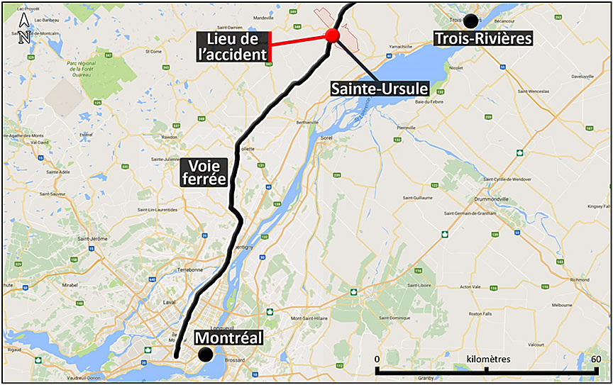 Le 20 septembre 2016, vers 16 h 05, heure avancée de l'Est, le train de voyageurs no 600 exploité par VIA Rail Canada Inc. roulait à 60 mi/h vers le sud dans la subdivision de Joliette de la Compagnie des chemins de fer nationaux du Canada. Le train a été percuté par un camion semi-remorque au passage à niveau public de la route 348 au point milliaire 75,34 à Sainte-Ursule (Québec). La première voiture-coach a déraillé, et les wagons ainsi que les locomotives ont été endommagés. Environ 1860 gallons de carburant se sont déversés. La voie et le dispositif d'avertissement du passage à niveau ont subi des dommages, et le camion semi-remorque a été détruit. Le conducteur a été grièvement blessé, et 2 voyageurs du train ont subi des blessures mineures.
