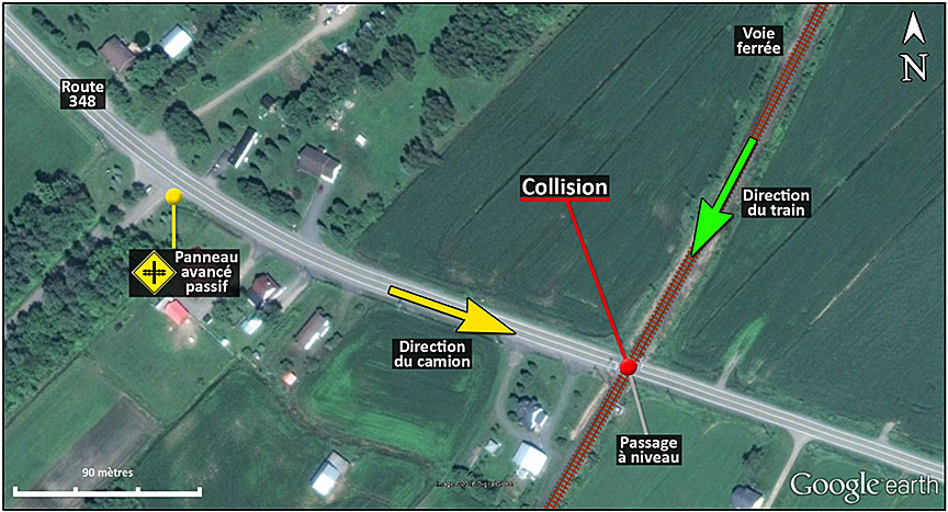 À la hauteur du passage à niveau, au point milliaire 75,34 de la subdivision de Joliette, la vitesse maximale permise sur la route 348 est de 90 km/h. Au passage à niveau, la route est perpendiculaire à la voie ferrée. Les conducteurs venant de l'ouest doivent négocier une courbe vers la gauche qui se termine à environ 500 pieds du passage à niveau. Du début de la courbe jusqu'au passage à niveau, les lignes de délimitation des voies peintes sur la chaussée étaient en bon état et indiquaient une interdiction de dépassement. Dans la courbe, à environ 730 pieds du passage à niveau, un panneau avancé passif annonçait le passage à niveau (figure 2). Aucune marque fraîche de freinage n'a été relevée sur la chaussée entre le panneau avancé et le passage à niveau.