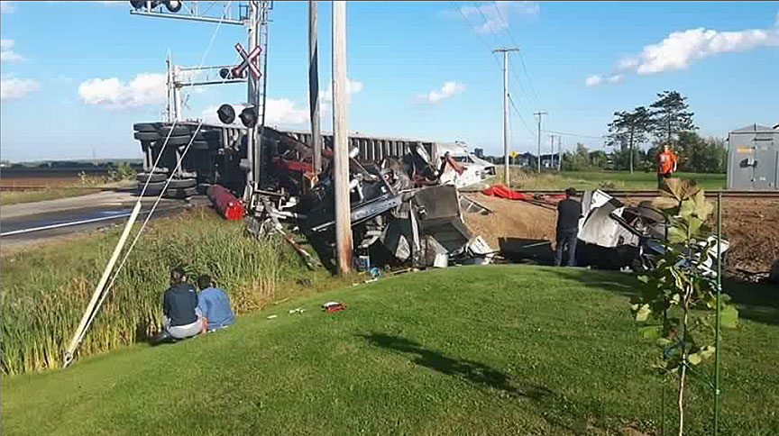 Le camion semi-remorque a été projeté vers le sud, heurtant le poteau du porte-à-faux sud du dispositif d'avertissement du passage à niveau ainsi qu'un poteau de services publics avant de s'immobiliser dans le fossé. La remorque s'est détachée du tracteur et a chaviré sur le côté. Le conducteur a subi des blessures graves.