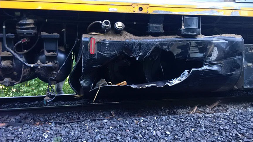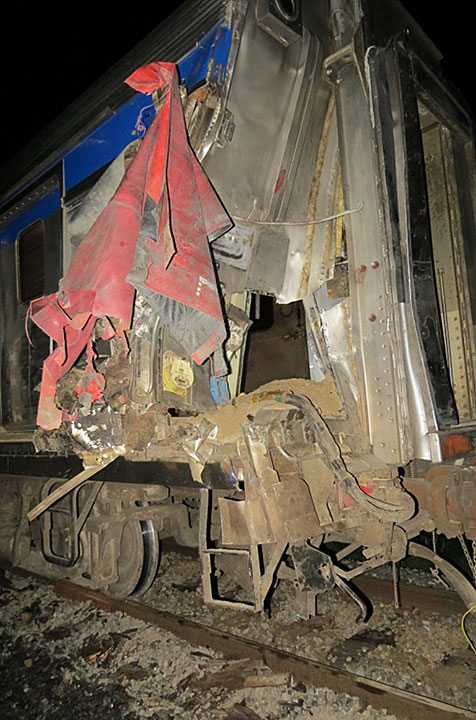 La première voiture-coach du train a déraillé, mais est restée debout. Les autres wagons ainsi que les 2 locomotives ont subi des dommages à leur côté droit. Du carburant provenant des réservoirs des 2 locomotives s'est déversé le long de la voie ferrée.