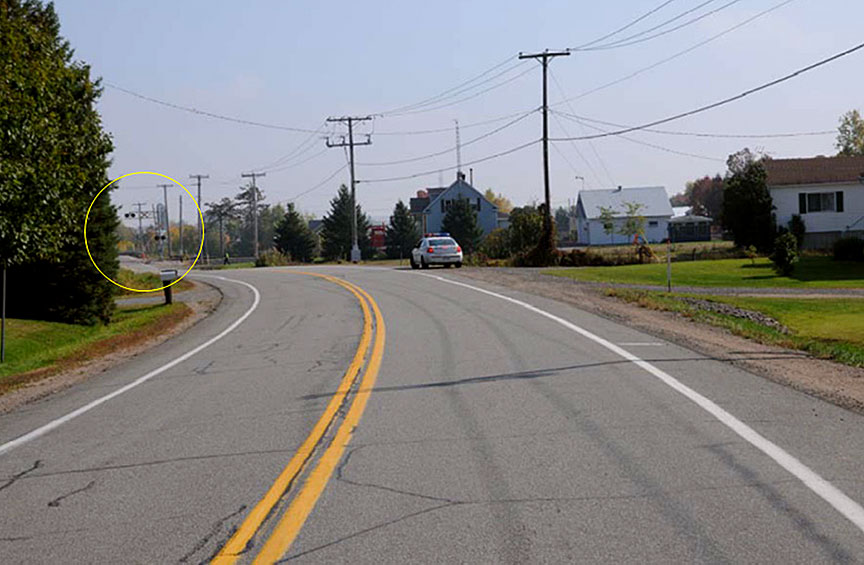 Les véhicules venant de l'ouest sur la route 348 doivent négocier une courbe vers la gauche avant d'atteindre le passage à niveau. Les arbres le long de la route obstruent la visibilité du dispositif d'avertissement du passage à niveau, qui ne devient partiellement visible qu'à environ 800 pieds du passage à niveau (figure 7).