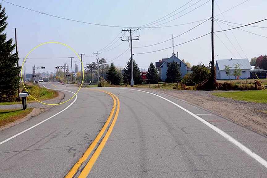 - Étant donné que la visibilité des feux du dispositif d'avertissement du passage à niveau est inférieure à la distance de visibilité d'arrêt, un panneau « Préparez-vous à arrêter » actif relié au dispositif d'avertissement du passage à niveau est exigé à cet endroit d'ici 2021 selon le nouveau Règlement sur les passages à niveau de Transports Canada.