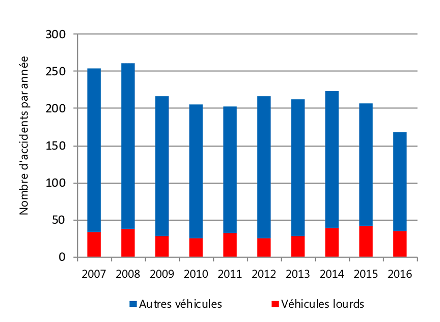 Une recherche dans la base de données du BST indique que, pour la période de 10 ans s'étendant de 2007 à 2016, il y a eu 1842 accidents à des passages à niveau. De ces accidents, 325 ont mis en cause des véhicules lourds. La moyenne annuelle a été relativement stable de 2009 à 2014. On peut observer une baisse des accidents depuis 2014 (figure 10).