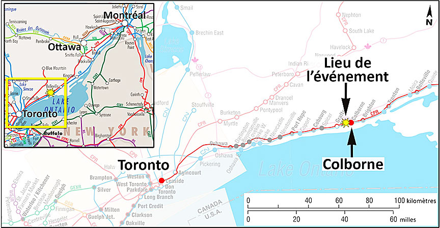 Le 13 février 2017, vers 7 h 32 (heure normale de l'Est), le train de marchandises 142-12 du Chemin de fer Canadien Pacifique, circulant vers l'est, a heurté un autobus scolaire immobilisé au passage à niveau public du chemin Town Line au point milliaire 121,36 de la subdivision de Belleville, près de Colborne (Ontario). Ce passage à niveau était muni de feux clignotants et d'une sonnerie. Le conducteur et les 2 passagers avaient quitté l'autobus scolaire et se trouvaient à une distance sécuritaire au moment de la collision. L'autobus et le mât de signalisation du côté nord ont été détruits. La locomotive a subi des dommages mineurs. Il n'y a pas eu de blessés.