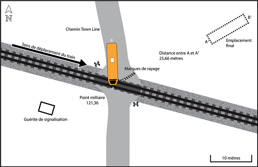 • À 7 h 26 min 1 s, l'autobus s'est immobilisé devant une maison au nord des voies du CN sur le chemin Town Line.