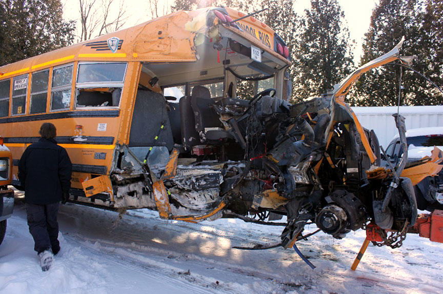 Vers 7 h 31, au moment où le train s'approchait de Colborne à 52 mi/h, l'équipe du train a aperçu un autobus scolaire immobilisé au passage à niveau du chemin Town Line (au point milliaire 121,36) et a commencé à actionner le siffletNote de bas de page 2. Lorsque l'équipe a constaté que l'autobus n'allait pas dégager le passage à niveau, le mécanicien de locomotive a serré les freins d'urgence. Le train, incapable de s'arrêter avant le passage à niveau, a percuté l'autobus. La collision a détruit l'autobus et le mât de signalisation du côté nord. Les 3 occupants avaient quitté l'autobus avant la collision. La locomotive de tête (CP 8768) a subi des dommages mineurs. Il n'y a eu ni blessés ni déraillement.