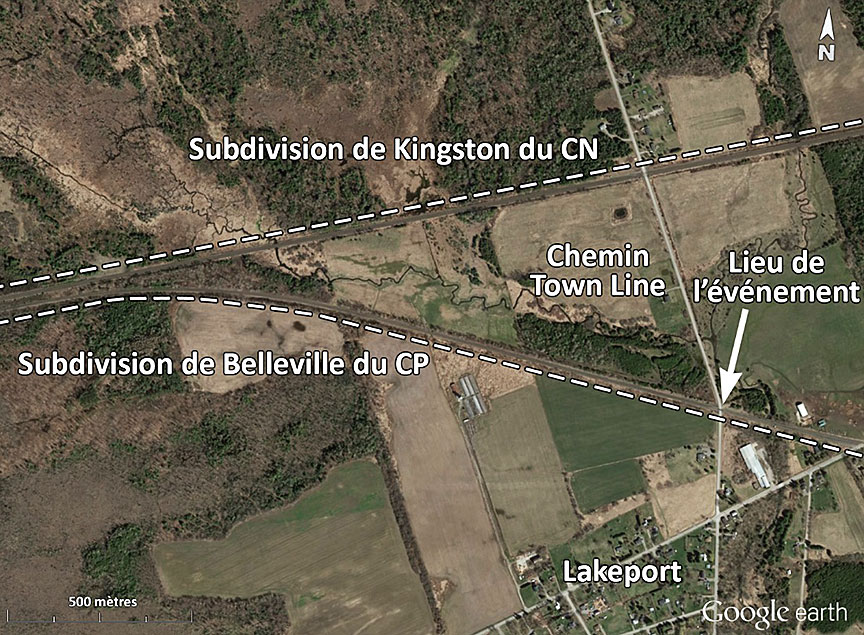 Aux environs du passage à niveau, la subdivision de Belleville est en alignement droit et s'étend d'est en ouest (figure 5). Vers l'ouest, la voie demeure en alignement droit sur environ 3000 pieds avant de virer vers le sud. L'indicateur autorisait une vitesse limite de 50 mi/h pour les trains de marchandises. Au moment de l'événement à l'étude, aucune limitation de vitesse temporaire n'était en vigueur dans la zone immédiate.