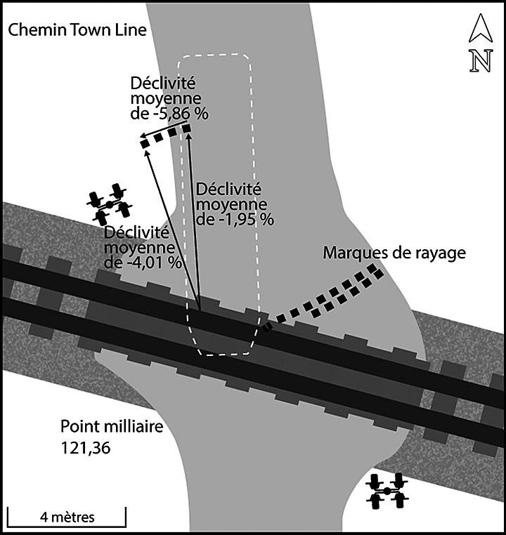 En direction sud vers le passage à niveau, la déclivité de la route est de 5,68 % jusqu'à environ 8 m (26,2 pieds) du rail le plus proche, puis elle diminue à une moyenne de 1,66 %. À 6,1 m (19,9 pieds) du rail le plus proche (à l'endroit approximatif où les pneus arrière de l'autobus immobilisé se trouvaient), la déclivité de la route était de 1,95 % (figure 6). À cet endroit, la pente perpendiculaire de la route (c.-à-d., vers l'accotement ouest) était de 5,86 %, ce qui se traduisait par une déclivité moyenne de 4,01 % près de l'accotement.