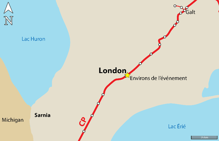 À 5 h 30Note de bas de page 1 le 31 juillet 2017, l'équipe du train de marchandises ordinaire 141-30 du Chemin de fer Canadien Pacifique (CP) venait de laisser 35 wagons au triage Quebec Street du CP à London (Ontario) (figure 1). Les membres de l'équipe (un chef de train et un mécanicien de locomotive [ML]) étaient aptes au travail et qualifiés pour leurs postes respectifs, et ils connaissaient bien la subdivision.