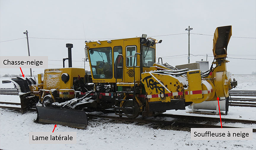 Le 13 février 2018, vers 9 h 30Note de bas de page 1, le véhicule d'entretien PNR 728 (VE) (figure 1), exploité par PNR RailWorks Quebec Inc. (PNR), a commencé à déblayer la neige entre Dorion (Québec) et Montréal-Ouest (Québec) sur la subdivision de Vaudreuil. Le VE était exploité par un opérateur de machinerie de PNR (opérateur) sous la supervision d'un contremaître du Chemin de fer Canadien Pacifique (CP). Le VE pesait environ 25 tonnes courtes et mesurait 38 pieds de longueur. Les 2 membres de l'équipe répondaient aux exigences de leurs postes respectifs et satisfaisaient aux exigences en matière de repos et de condition physique. Au début du quart de travail, dans le cadre d'une séance de breffage, il avait été convenu que le contremaître préviendrait l'opérateur à l'approche de tous les passages à niveau (PN).