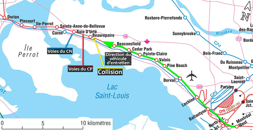 Après avoir terminé le déblayage à Montréal-Ouest, le VE devait libérer les voies pour l'heure de pointe des trains de banlieue de la ligne Vaudreuil-Hudson du Réseau de transport métropolitain. N'ayant pas été en mesure d'obtenir une autorisation du contrôleur de la circulation ferroviaire (CCF) pour occuper les voies adjacentes lors du renversement du sens de direction du VENote de bas de page 2, celui-ci a dû se rediriger vers Dorion, sur la voie sud et en marche arrière, avec la souffleuse à neige dans le sens du déplacement. À 14 h 18, un permis d'occuper la voie a été obtenu pour circuler entre Beaconsfield et Dorion.