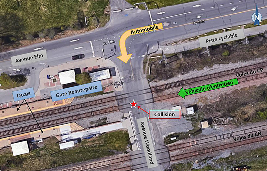 La collision a eu lieu à un PN public équipé d'un système d'avertissement (sonnerie, feux clignotants et barrières) qui n'était pas activé par le VENote de bas de page 3. Le PN croise 4 voies ferréesNote de bas de page 4 tangentes à 90° dans un quartier urbain. L'avenue Elm est située du côté nord de l'emprise du CP et est parallèle aux voies ferrées. Une piste cyclable, des arbres et des poteaux de service électrique longent le côté sud de l'avenue Elm. La gare de train de banlieue Beaurepaire est située immédiatement à l'ouest du PN. Des quais pour voyageurs se trouvent des 2 côtés des voies du CP (figure 3). Le PN permet aux automobilistes circulant sur l'avenue Elm d'accéder à l'autoroute 20 et à la partie sud de la ville de Beaconsfield.