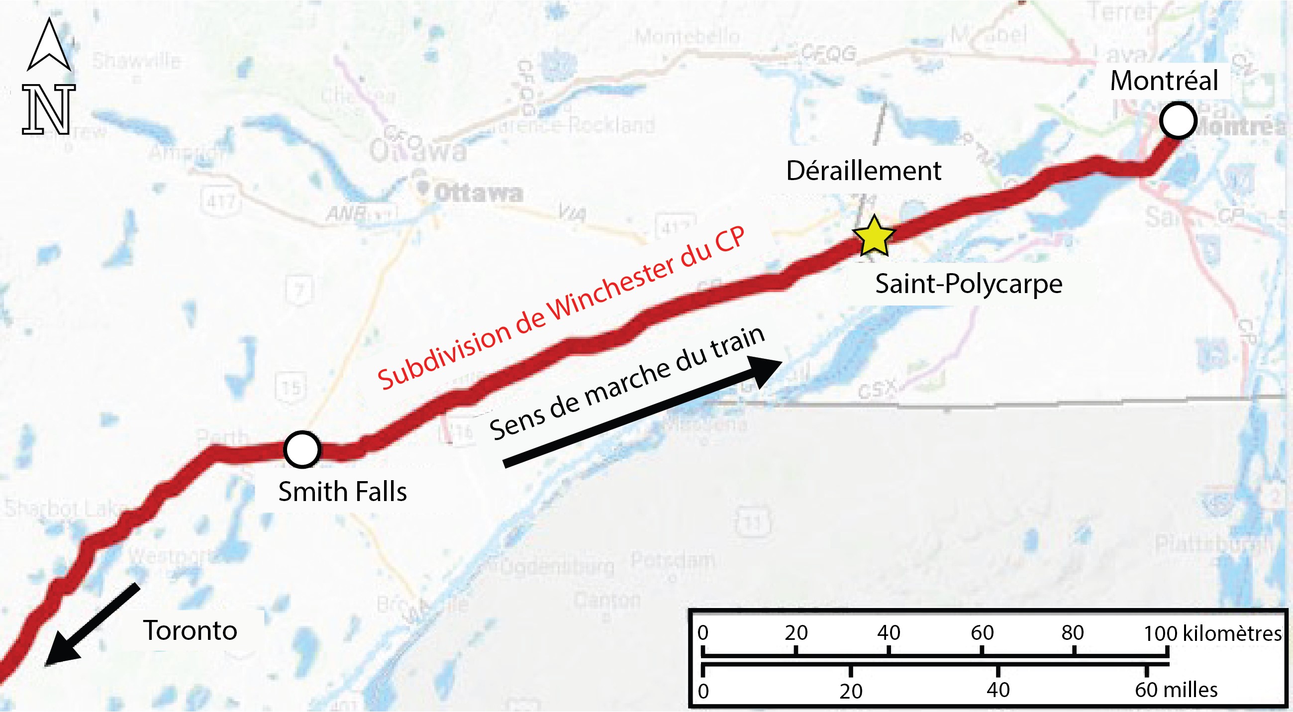 À 18 h 45, pendant que le train circulait vers l'est sur la voie sud de la subdivision de Winchester du CP, un freinage d'urgence provenant de la conduite générale s'est produit au point milliaire 35,82, près de Saint-Polycarpe (Québec) (figure 1). Une inspection a révélé que 22 wagons avaient déraillé. Il n'y a eu aucun blessé ni rejet de marchandises dangereuses.