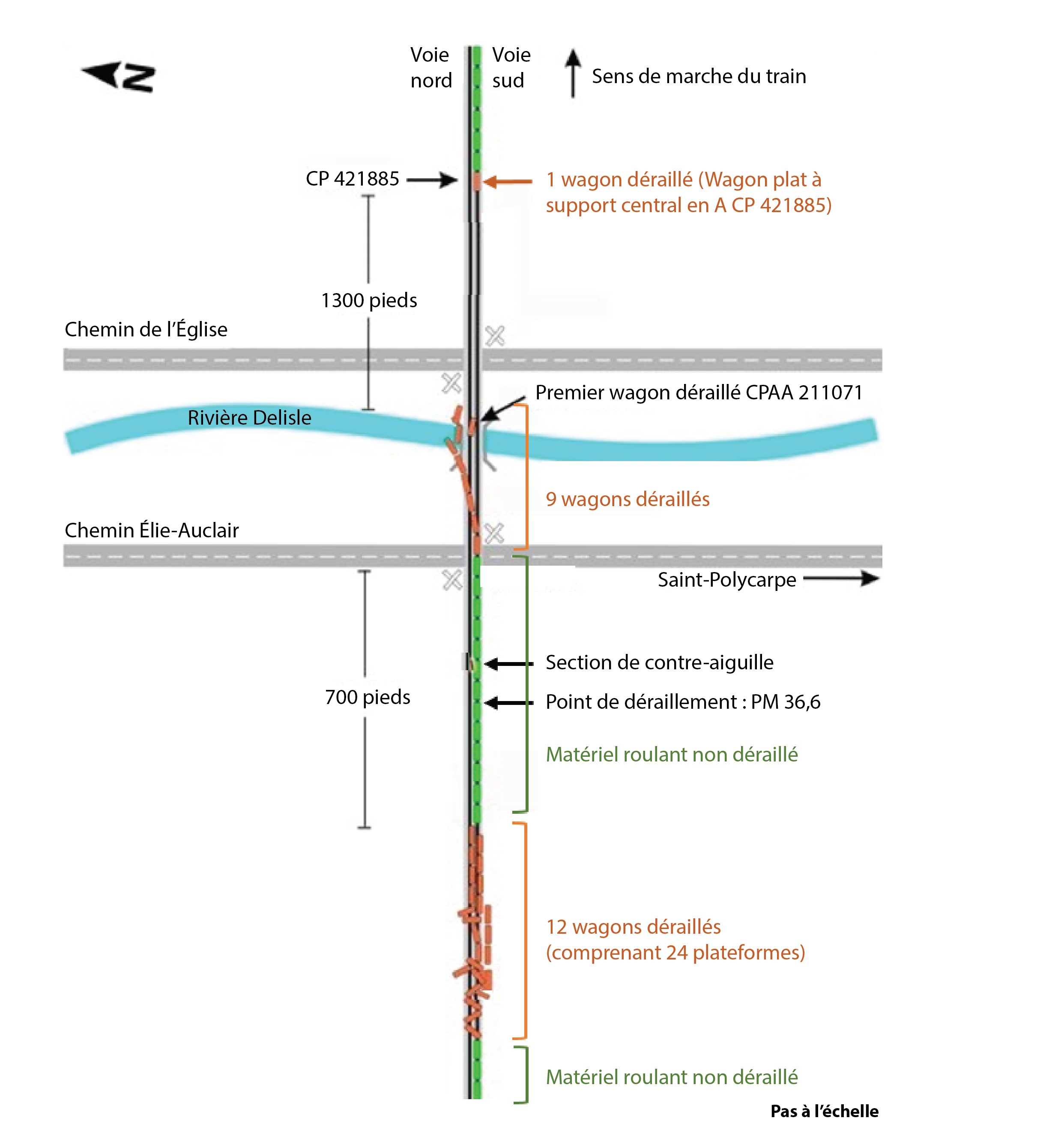 Le bogie avant du wagon a déraillé à environ 400 pieds à l'ouest du passage à niveau du chemin Élie-Auclair (point du déraillement), mais le wagon CPAA 211071 a poursuivi sa course jusqu'à ce qu'il atteigne le passage à niveau du chemin Élie-Auclair, où il a percuté la surface de croisement, a déraillé complètement et s'est séparé du train, causant le déraillement des 8 wagons derrière lui. Les wagons déraillés ont détruit la structure de voie à l'est du passage à niveau en tombant du pont jusque dans la rivière.