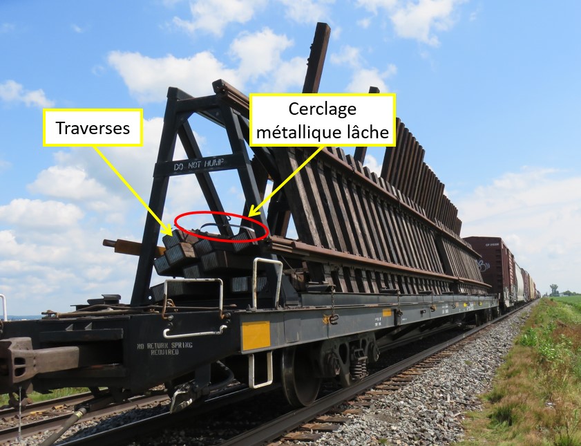 - Dans des conditions d'exploitation normale, le chargement de traverses, surmonté d'un contre-aiguille plus lourd, s'est graduellement déplacé de côté et est tombé, ce qui a causé le desserrage des 2 cerclages métalliques.