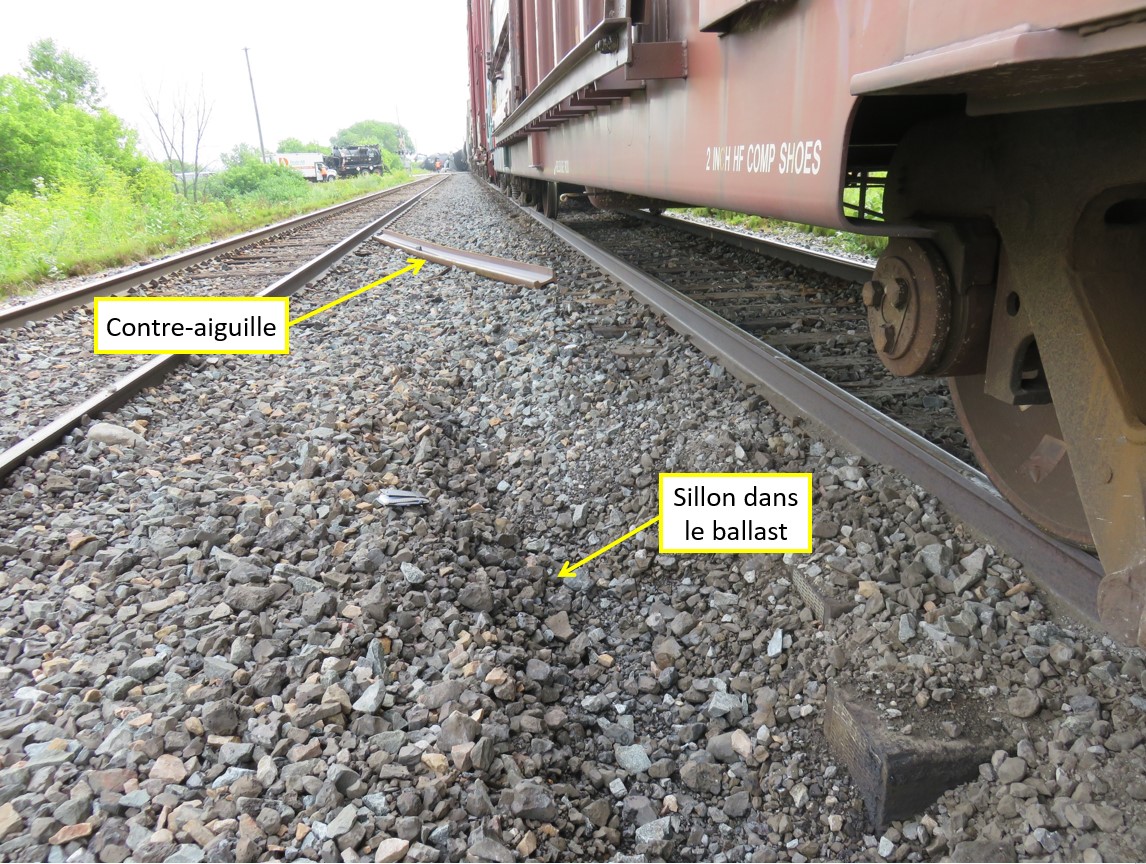 - Le contre-aiguille a été placé au-dessus des traverses plutôt que sur les supports de fixation latéraux du wagon. L'enquête n'a pas permis de déterminer pourquoi le contre-aiguille n'avait pas été installé sur les supports de fixation latéraux du wagon conformément à la méthode du CP.