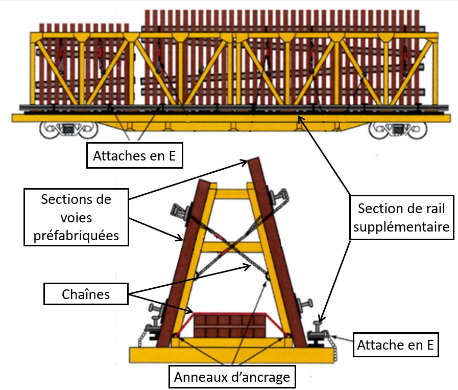 - Les sections de voie préfabriquées étaient arrimées au cadre en A au moyen de chaînes. Le chargement sous le cadre en A comprenait la pile de 14 traverses, surmontée d'un contre-aiguille. Il était arrimé au moyen de 2 cerclages métalliques enfilés dans des anneaux d'ancrage (figure 10).