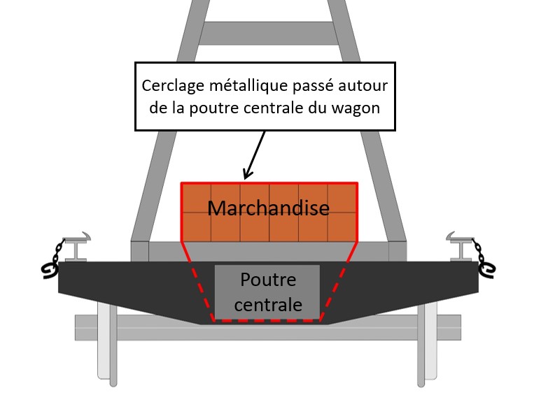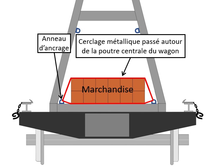 - Le matériel chargé sur le plancher des wagons, sous le cadre en A, était arrimé au moyen de cerclages métalliques passant au travers du plancher et autour de la poutre centrale.