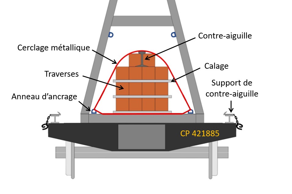 - Le contre-aiguille avait été chargé au-dessus des traverses non liées entre elles, disposées sur le plancher sous le cadre en A, le tout arrimé avec 2 cerclages métalliques passés dans les anneaux d'ancrage.
