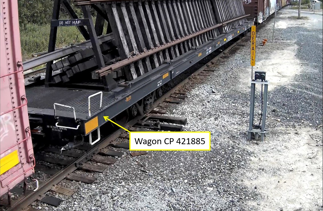 En raison de l'apparence visuelle d'un wagon plat à support central en A, il peut être difficile de repérer un chargement déplacé, mais d'après des images de caméras vidéo de triages, le chargement sur le wagon CP 421885 était déjà déplacé à White River, après qu'il eut parcouru environ 1080 km (670 milles) au sein du train 420-13. Il y avait d'autres indices visuels d'un déplacement du chargement sur des images vidéo à l'arrivée du wagon à Toronto le 15 juillet 2018, de même que lors de son départ de cet endroit au sein du train 142-14 le 16 juillet 2018.