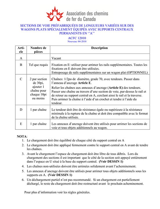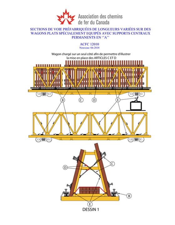 Annexe A – Association des chemins de fer du Canada – Circulaire ACFC 12010 – Sections de voie préfabriquées de longueurs variées sur des wagons plats spécialement équipés avec supports centraux permanents en « A »