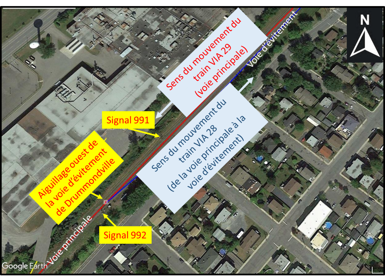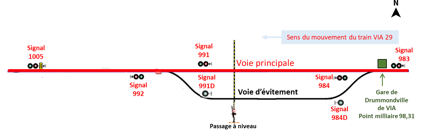 La subdivision de Drummondville du CN est une voie principale simple qui comporte plusieurs voies d’évitement où les trains peuvent se croiser. Conformément à l’horaire de VIA, les 2 trains se rencontraient généralement à DrummondvilleNote de bas de page 2. Vers 19 h 26, en préparation pour le croisement, la contrôleure de la circulation ferroviaire (CCF) du CN, en poste à Montréal, a orienté l’aiguillage ouest de la voie d’évitement de Drummondville pour permettre au train VIA 28 de s’engager dans la voie d’évitement. Elle a ensuite prévu l’itinéraire des 2 trains au-delà de Drummondville en demandant d’avance le signal 984D pour le train VIA 28 et les signaux 991, 1005 et 1027 pour le train VIA 29. Le train VIA 29 devait continuer à rouler sur la voie principale à Drummondville.
