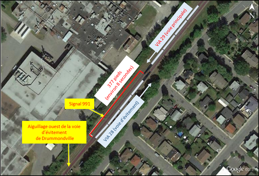 | 19 h 36 min 28 s | Le signal 991, affichant une indication d’arrêt absolu, pouvait être aperçu par l’équipe du train VIA 29. |