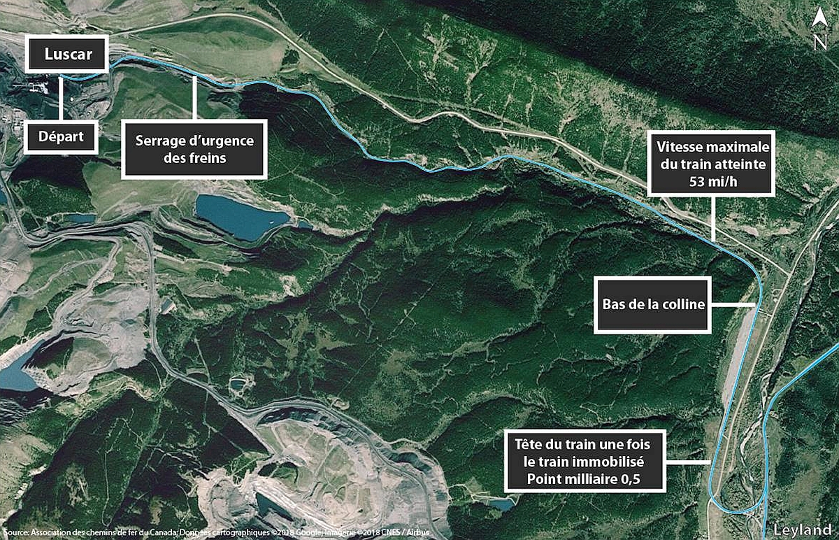 Le 10 janvier 2018, vers 2 h 28, heure normale des Rocheuses, le train de marchandises L76951-10 de la Compagnie des chemins de fer nationaux du Canada, roulant en direction du sud sur l’embranchement industriel de Luscar, en provenance de l’installation de chargement de charbon Cardinal River Operations de Teck Resources Limited près de Cadomin (Alberta), a subi une perte de maîtrise alors qu’il descendait une pente en terrain montagneux vers Leyland (Alberta). Le train a atteint une vitesse maximale de 53 mi/h avant de s’arrêter au point milliaire 0,5. Il n’y a eu aucun blessé.
