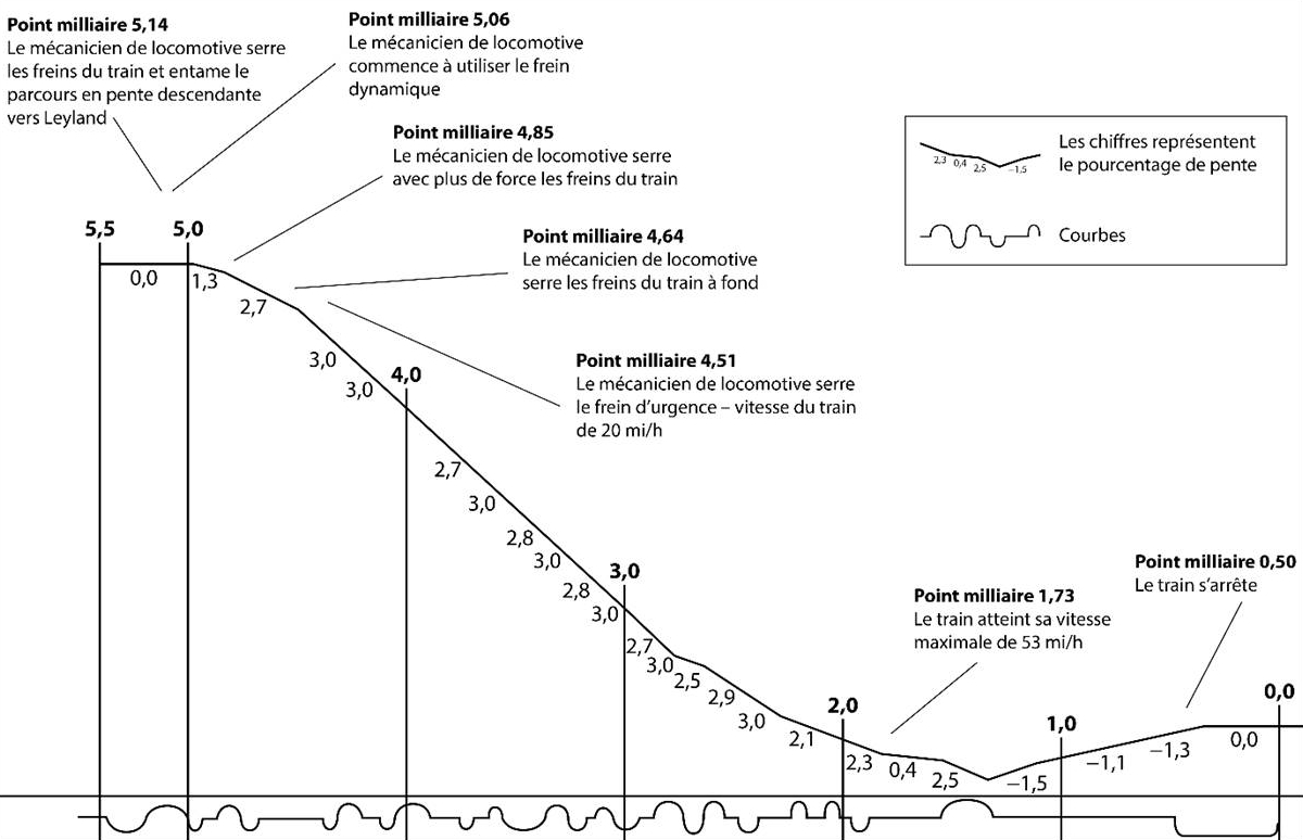 Le train a continué à accélérer en descendant la pente. Vers le point milliaire 1,73, le train a atteint une vitesse de 53 mi/h. Le train n’a pas commencé à ralentir avant le point milliaire 1,48 environ. Vers 2 h 39, le train s’est arrêté, avec la tête s’immobilisant au point milliaire 0,5 environ. Le CCF a continué de garder une voie de communication ouverte avec l’équipe après que le train s’était arrêté, indiquant à l’équipe de prendre quelques minutes pour évaluer la situation.