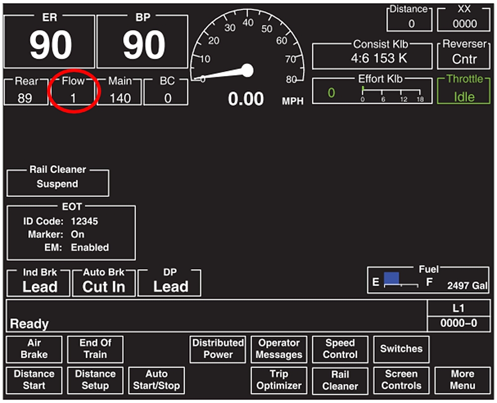 Les locomotives ont été attelées au train, les tuyaux de la conduite générale ont été accouplés et les robinets d’arrêt entre la locomotive menée et le 1er wagon ont été ouverts. La pression de la conduite générale à la locomotive de commande a été fixée à 90 lb/po². La continuité de la conduite générale a été confirméeNote de bas de page 13, l’écran du conducteur indiquant que la pression à la queue augmentait. Environ 17 minutes après l’ouverture des robinets d’arrêt entre la locomotive menée et le 1er wagon, l’indicateur du débit d’airNote de bas de page 14 s’était stabilisé à 33 pieds cubes par minute (CFM) et la pression de la conduite générale à la fin du train indiquée était de 88 lb/po². Le système de freinage pneumatique du train était considéré comme pleinement chargé, avec un vrai gradient de conduite généraleNote de bas de page 15 de 2 lb/po². À ce moment, l’équipe était prête à ramener le train à Holloway.