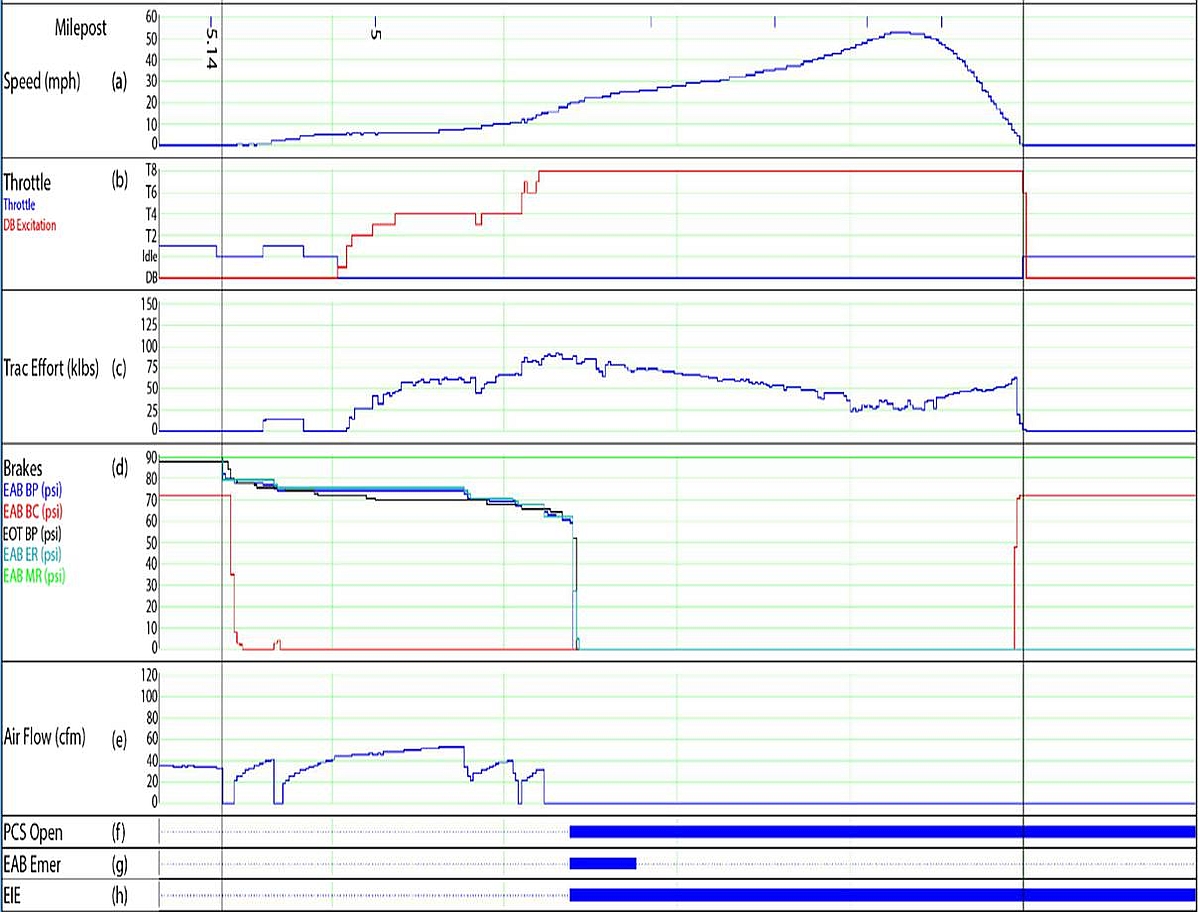Alors que la vitesse du train atteignait environ 14 mi/h, le levier du frein dynamique a été mis à la position 8 et la poignée du robinet de mécanicien a été mise en position de serrage à fond. Même avec les freins du train entièrement serrés et le frein dynamique produisant un effort décélérateur maximum, le train continuait à accélérer. Le ML a observé sur l’accéléromètre que le taux d’augmentation de la vitesse était plus élevé que la normale, indiquant que la force de freinage était insuffisante. Aux environs du point milliaire 4,51, la vitesse du train avait atteint 20 mi/h et le ML a mis la poignée du robinet de mécanicien à la position d’urgenceNote de bas de page 19. Un freinage d’urgence devrait entraîner une augmentation de la pression au cylindre de frein d’environ 20 % à chaque wagon du train.