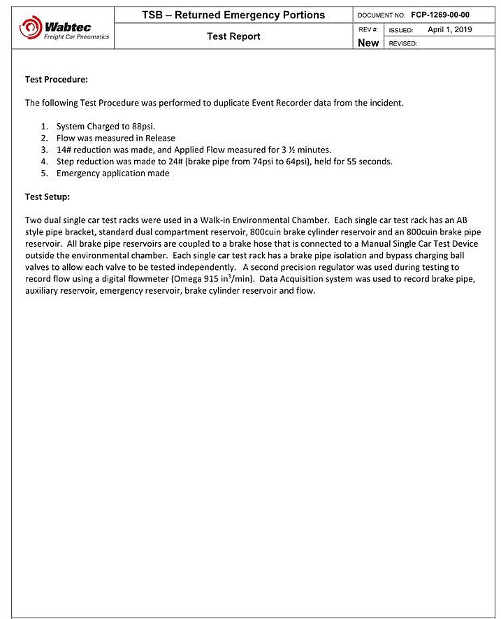 Un essai des freins à air d’un wagon individuel vérifie l’efficacité des freins à air d’un wagon et confirme, entre autres, que les freins restent serrés et que les fuites de pression d’air restent sous des niveaux prédéterminés. Toutefois, les exigences actuelles ne comprennent pas les essais par temps froid, lorsque des vulnérabilités dans l’efficacité des freins à air sont plus susceptibles de se manifester. À l’heure actuelle, l’essai des freins à air d’un wagon individuel est le plus souvent effectué dans un environnement contrôlé à l’intérieur d’un atelier, où les températures ne reflètent pas les conditions d’exploitation. Bien que les essais sur wagons individuels puissent valider la fonction des distributeurs de freins à air à des températures de fonctionnement modérées, l’industrie ne dispose pas d’une méthode d’essai pratique pour repérer les vulnérabilités opérationnelles dans les distributeurs de freins à air dans des opérations par temps froid extrême.