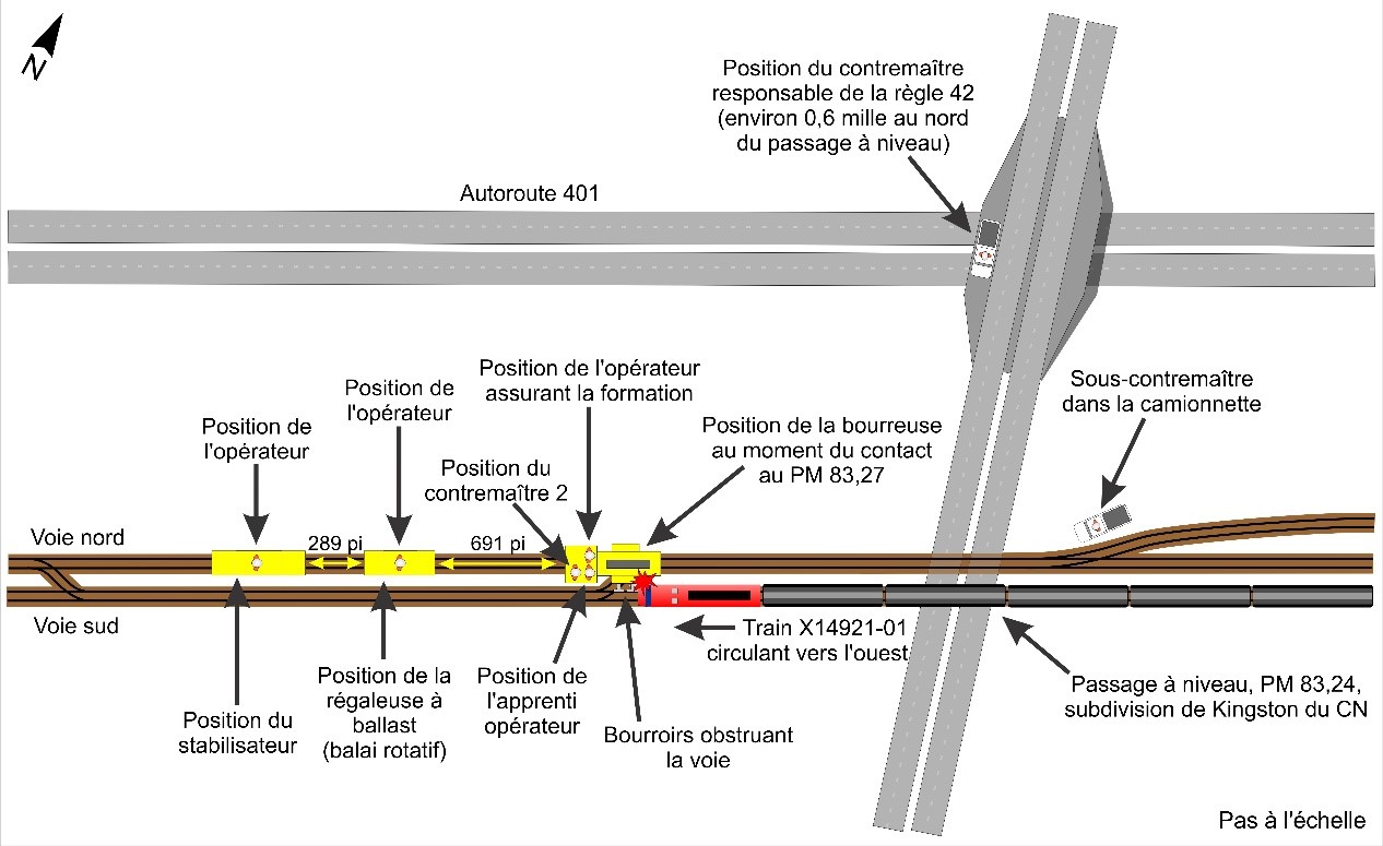 Le sous-contremaître, qui s’affairait à d’autres tâches opérationnelles, était dans son camion du côté nord de l’emprise du chemin de fer, à environ 250 pieds à l’est des machines d’entretien de la voie qui étaient sous sa protection (un stabilisateur, une régaleuse à ballast et une bourreuse). De cet endroit, il n’était pas en position ni n’était tenu de voir le côté sud des machines d’entretien de la voie, incluant la bourreuse.