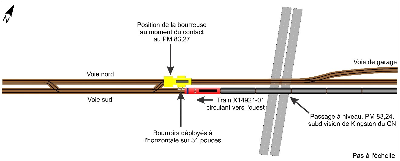 À cet endroit, il y a 2 voies principales; la voie nord et la voie sud (figure 2). Lors de l’événement, les travaux étaient en cours sur la voie nord et protégés en vertu de la règle 42 (Protection prévue) du Règlement d’exploitation ferroviaire du Canada (REFC)Note de bas de page 4.