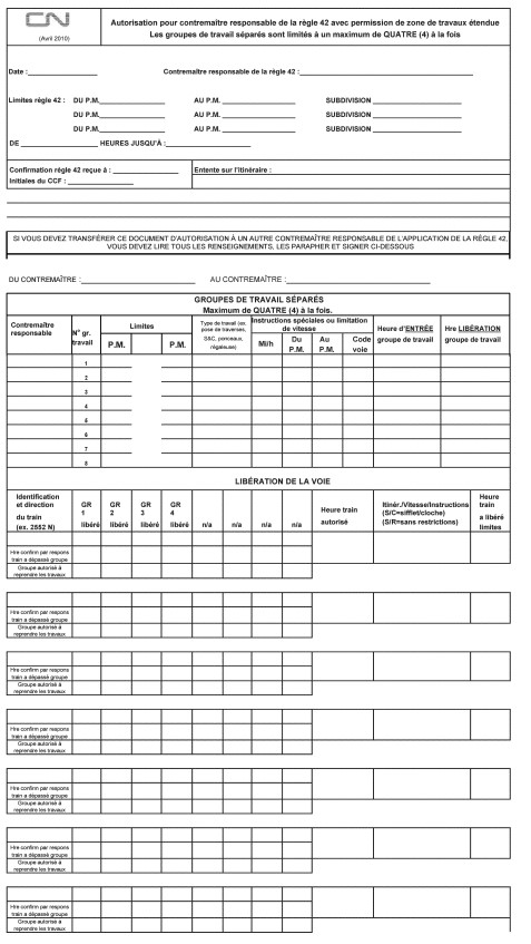 Au CN, les contremaîtres responsables de la règle 42 disposaient d’un formulaire à utiliser comme aide-mémoire. Ce document est pratique parce que les contremaîtres responsables de la règle 42 peuvent y consigner des détails sur la règle 42, dont : la zone protégée et la plage horaire; l’heure de la confirmation de la règle 42 au contrôleur de la circulation ferroviaire (CCF); les initiales du CCF; les noms des employés à qui il a accordé une protection de sous-contremaître en vertu de la règle 42 pour protéger des groupes de travail séparés. La section du formulaire intitulée « Groupes de travail séparés » fixe à 4 le nombre maximal de sous-contremaîtres et spécifie les limites de la zone de travaux des sous-contremaîtres, le type de travail effectué et les heures auxquelles un groupe de travail séparé entre au travail et signale qu’il a libéré la voie.
