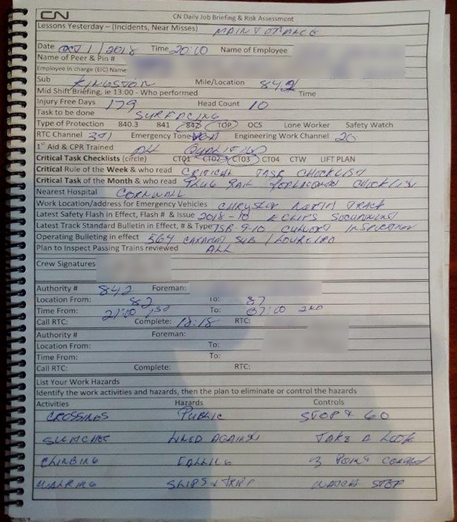 Au CN, les sous-contremaîtres d’équipes de cheminots n’avaient aucun formulaire standard pour les aider à superviser les employés et les équipements dont ils étaient responsables. Pour le faire, certains sous-contremaîtres griffonnaient des notes sur du papier, d’autres se fiaient à leur mémoire. Les sous-contremaîtres avaient à leur disposition la liste de libération de la voie des contremaîtres responsables de la règle 42 (annexe B) et pouvaient l’utiliser comme aide-mémoire officiel. Toutefois, lors de l’événement à l’étude, le sous-contremaître ne savait pas que ce formulaire était disponible et qu’il pouvait s’en servir.