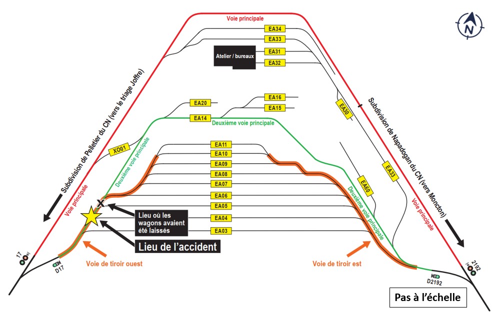 - Le train de manœuvre (groupe de traction et wagon HS 3205) a été déplacé de la voie EA10 à la voie EA08 (par la voie de tiroir ouest), parcourant environ 2200 pieds. Lors de ce déplacement, les freins à air du wagon HS 3205 ont été serrés pendant 5 secondes.
