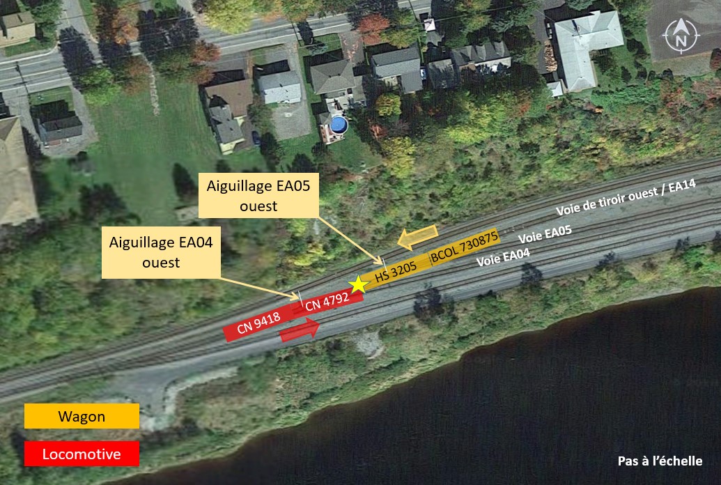 La locomotive de queue CN 4792 était orientée vers l’est, engagée dans la voie EA04 et immobilisée sur le cœur de croisement du branchement EA04 ouest. Une dizaine de pieds la séparait du wagon HS 3205. Le chasse-pierres, le garde-corps de la plateforme, l’échelle et le marchepied du coin nord-est de la locomotive étaient endommagés.