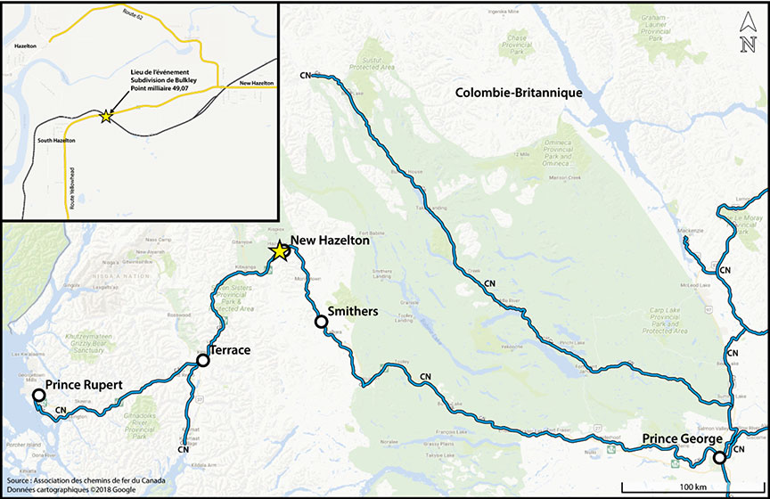 Le 19 janvier 2018, vers 5 h 25Note de bas de page 1, le train de marchandises C76751-17 de la Compagnie des chemins de fer nationaux du Canada (CN) a quitté Smithers (Colombie-Britannique) (point milliaire 0,0 de la subdivision de Bulkley du CN). Il se dirigeait vers l'ouest à destination de Prince-Rupert (Colombie-Britannique) (point milliaire 147,4 de la subdivision de Skeena du CN) (figure 1). Ce train à traction répartie était composé de 3 locomotives et de 199 wagons-tombereaux chargés de charbon, et était configuré comme suit : 2 locomotives de tête suivies de 102 wagons-tombereaux chargés, puis 1 locomotive en milieu de train suivie de 97 wagons-tombereaux chargés. Le train pesait 28 069 tonnes courtes et mesurait 10 785 pieds.