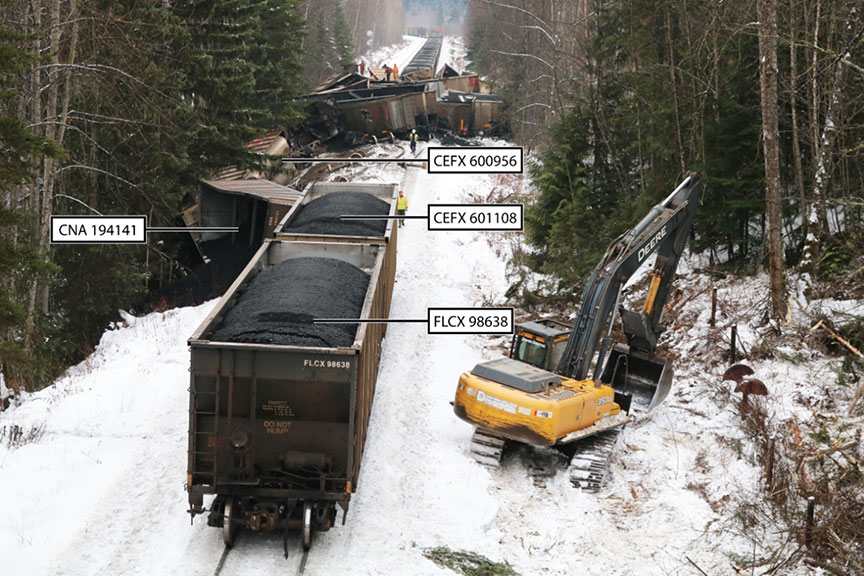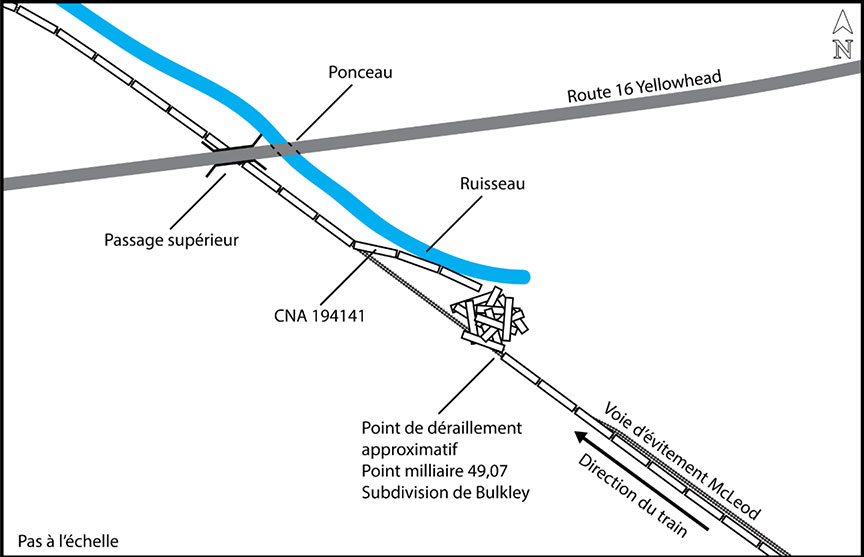 - Un des essieux du 52e wagon (CNA 194141) s'est rompu, ce qui a entraîné le déraillement de 27 wagons.