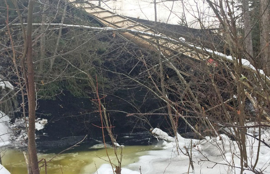 Le déraillement a entraîné le déversement de quelque 2900 tonnes courtes de charbon thermiqueNote de bas de page 2 qui se trouvait dans 24 des wagons-tombereaux ayant déraillé. La majorité du charbon est demeurée sur l'emprise ferroviaire. On estime que le volume total de charbon récupéré était de 2800 tonnes courtes, ce qui représente 97 % du produit déversé. Une petite quantité de charbon s'est déversée dans la crique Mission (figure 4).