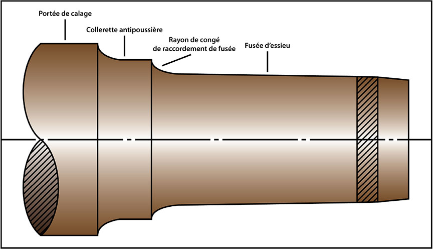 Durant le montage des essieux, les roues de train sont emmanchées à la presse sur les portées de calage de l'essieu. Les roulements à rouleaux sont ensuite emmanchés à la presse sur les fusées d'essieux. Le diamètre transversal de la portée de calage et de la fusée d'essieu est différent (plus grand et plus petit, respectivement). Ils sont reliés par 2 rayons consécutifs (celui de la collerette antipoussière et celui du congé) (figure 5). Les rayons de la collerette antipoussière du congé requièrent des transitions profilées et lisses.