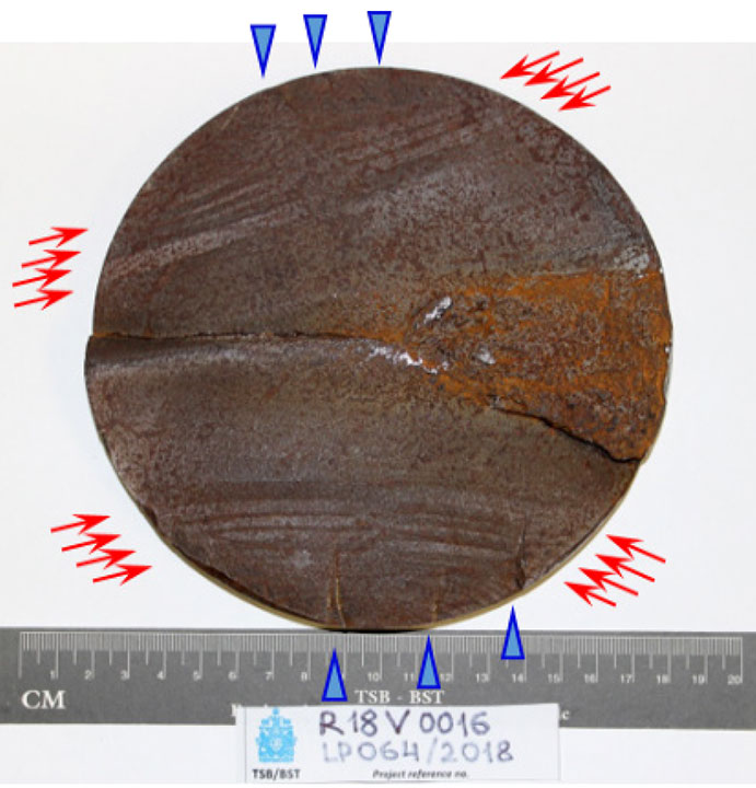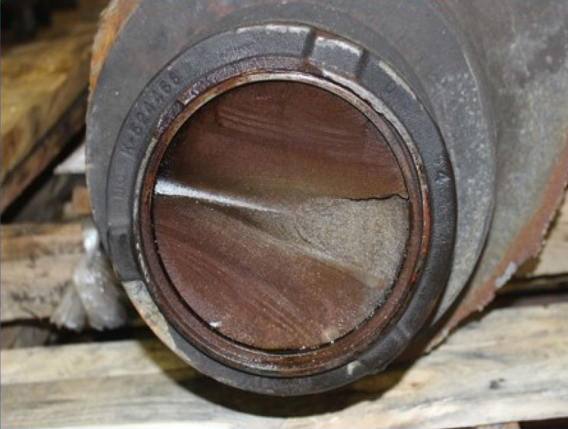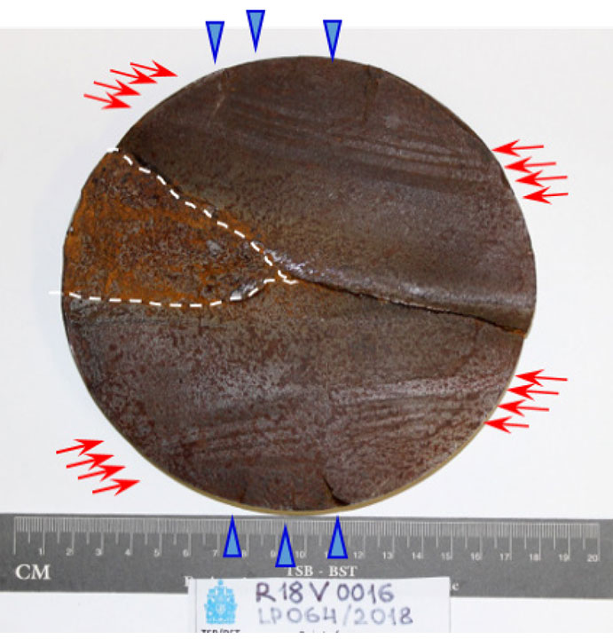 - Des fissures de fatigue de multiples origines ont fusionné en 2 larges fissures de fatigue qui ont convergé. Ces fissures de fatigue ont fusionné vers le centre de la section transversale.