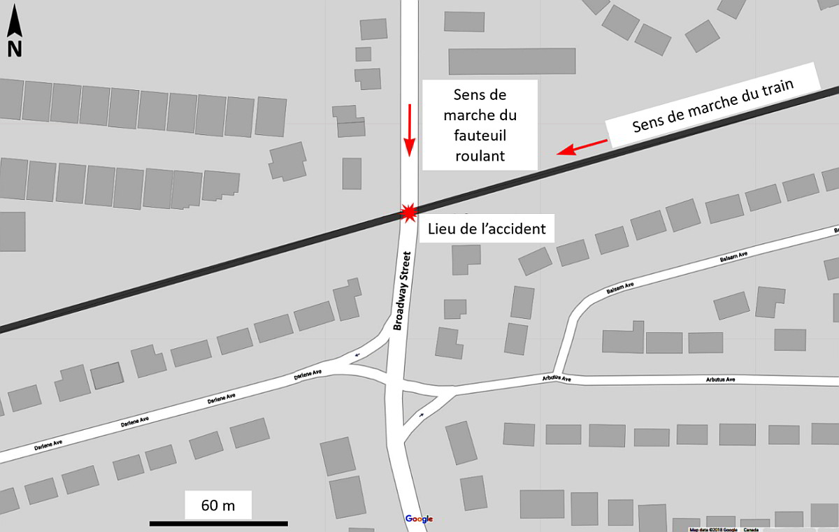 L'équipe avait fait sonner la cloche de la locomotive à proximité du panneau indicateur d'emploi du sifflet (à environ ¼ mille à l'est du passage à niveau). Comme le règlement municipal interdisant le signal par sifflet était en vigueur au passage à niveau en cause, l'équipe de train n'a pas utilisé le klaxon de locomotive avant qu'elle aperçoive le piéton sur le passage à niveau. Les 2 automobilistes ont été incapables de dégager le fauteuil roulant de la voie ou d'extraire le piéton de son fauteuil roulant pour le mettre en lieu sûr. Le train circulait à environ 47 mi/h lorsqu'il a happé le piéton et 1 des 2 automobilistes venus à son secours. Le piéton a été mortellement blessé, et l'automobiliste a été grièvement blessé.