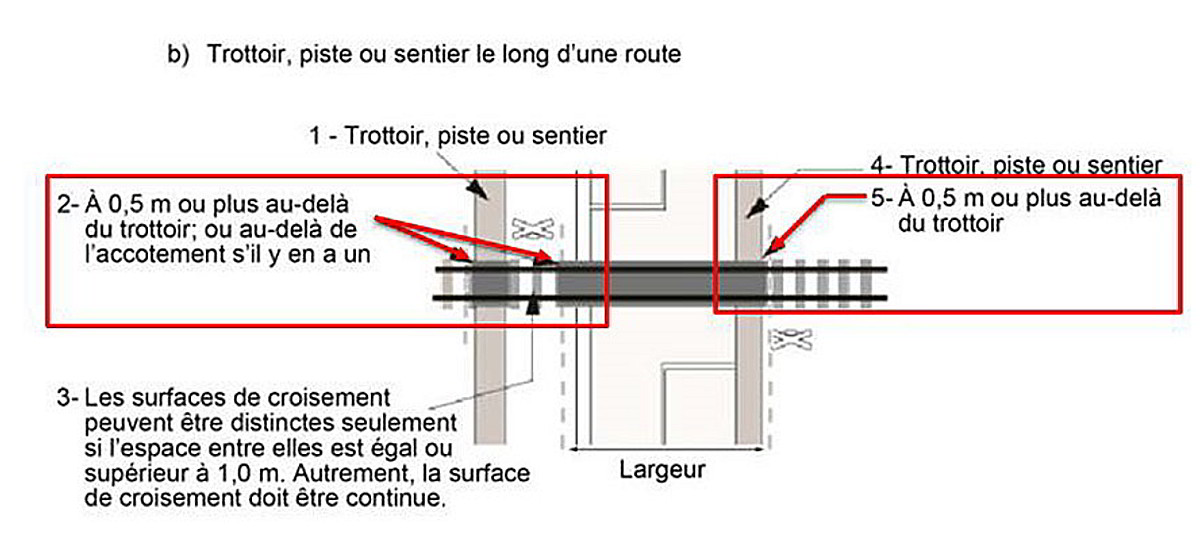 D'après la partie C, figure 5-1 b) des NPN, la surface de croisement doit se prolonger d'au moins 0,5 m au-delà du trottoir (figure 4). Le passage à niveau était conforme aux NPN au moment de l'événement, même si cette conformité n'était exigible qu'à compter de novembre 2021.