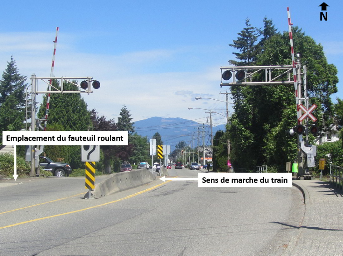 Le piéton connaissait bien le passage à niveau et l'avait déjà franchi plusieurs fois avec son fauteuil roulant électrique. Toutefois, dans l'événement à l'étude, le piéton a immobilisé son fauteuil roulant à plusieurs reprises aux environs du passage à niveau avant que le train n'atteigne celui-ci. Au moment où le train approchait du passage à niveau, le fauteuil roulant électrique s'est immobilisé lorsque le piéton, qui s'était arrêté avec les roues arrière sur le rail sud (c.-à-d. à l'écart de l'ornière du rail sud), a déplacé son fauteuil roulant en sens opposé; c'est ainsi que les deux roulettes arrière sont tombées dans l'ornière du rail sud.