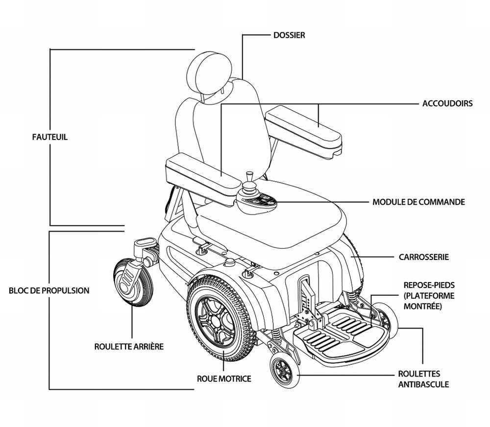 Les fauteuils roulants électriques donnent une mobilité autonome aux personnes qui sont incapables de manœuvrer un fauteuil roulant manuel. Les fauteuils roulants électriques sont conçus pour assurer une stabilité et des déplacements sur des surfaces généralement lisses. Ils sont habituellement dotés de grandes roues motrices, de roulettes pivotantes plus petites et d'un dispositif antibasculement. Les roues motrices refusent de tourner à moins que l'occupant du fauteuil actionne la manette de contrôle pour amorcer un mouvement directionnel. Les roulettes pivotantes facilitent les manœuvres dans les endroits étroits, comme sur les coins de rue et dans les cadres de porte. Sur la plupart des fauteuils roulants électriques au Canada, les roulettes pivotantes mesurent de 2 pouces (51 mm) à 4 pouces (102 mm) de large Note de bas de page 19.