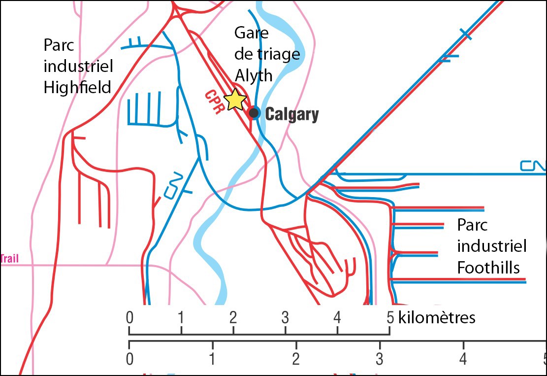 Le 6 janvier 2019, vers 6 h 55Note de bas de page 1, la manœuvre de triage CW11-06 du Chemin de fer Canadien Pacifique (CP) effectuait du poussage libre de wagonsNote de bas de page 2 vers l’est dans la gare de triage Alyth (triage C)Note de bas de page 3 du CP à Calgary (Alberta) (figure 1).