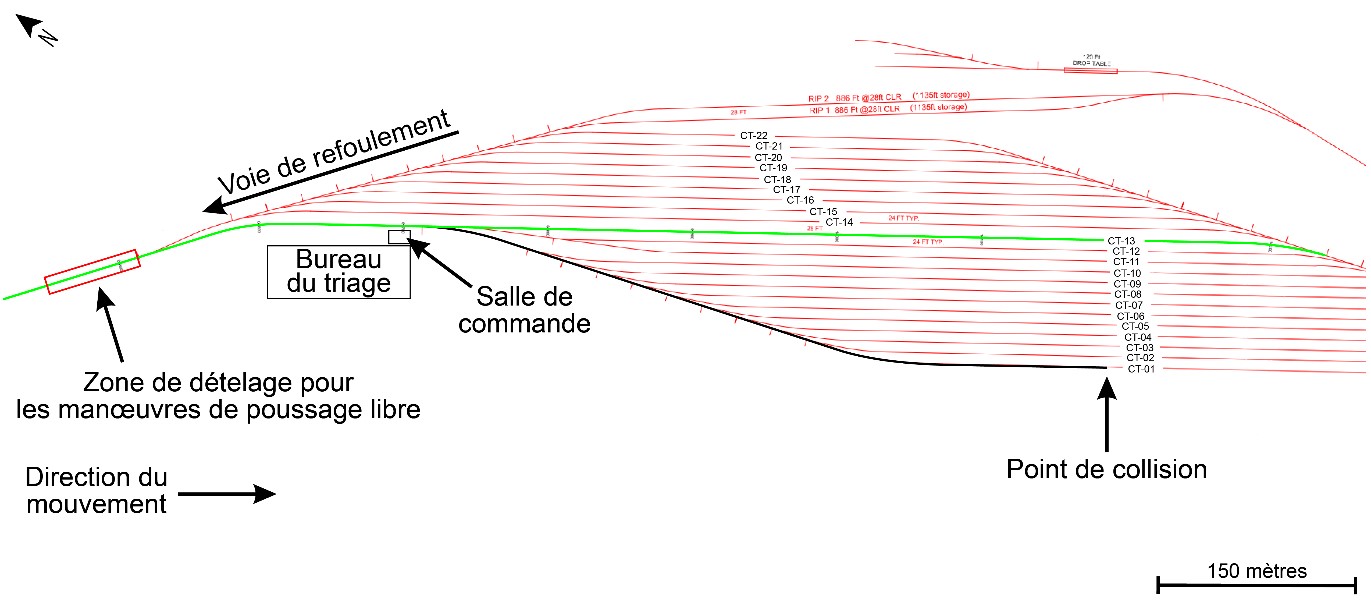 L’aide de triage a orienté l’aiguillage vers la voie CT-01, soit la voie d’urgence désignée. Les 3 wagons-citernes du mouvement précédent et la rame de wagons à la dérive sont entrés dans la voie CT-01, où ils ont heurté 14 wagons-trémies chargés immobiles à environ 440 pieds à l’est du point de dégagement ouest.